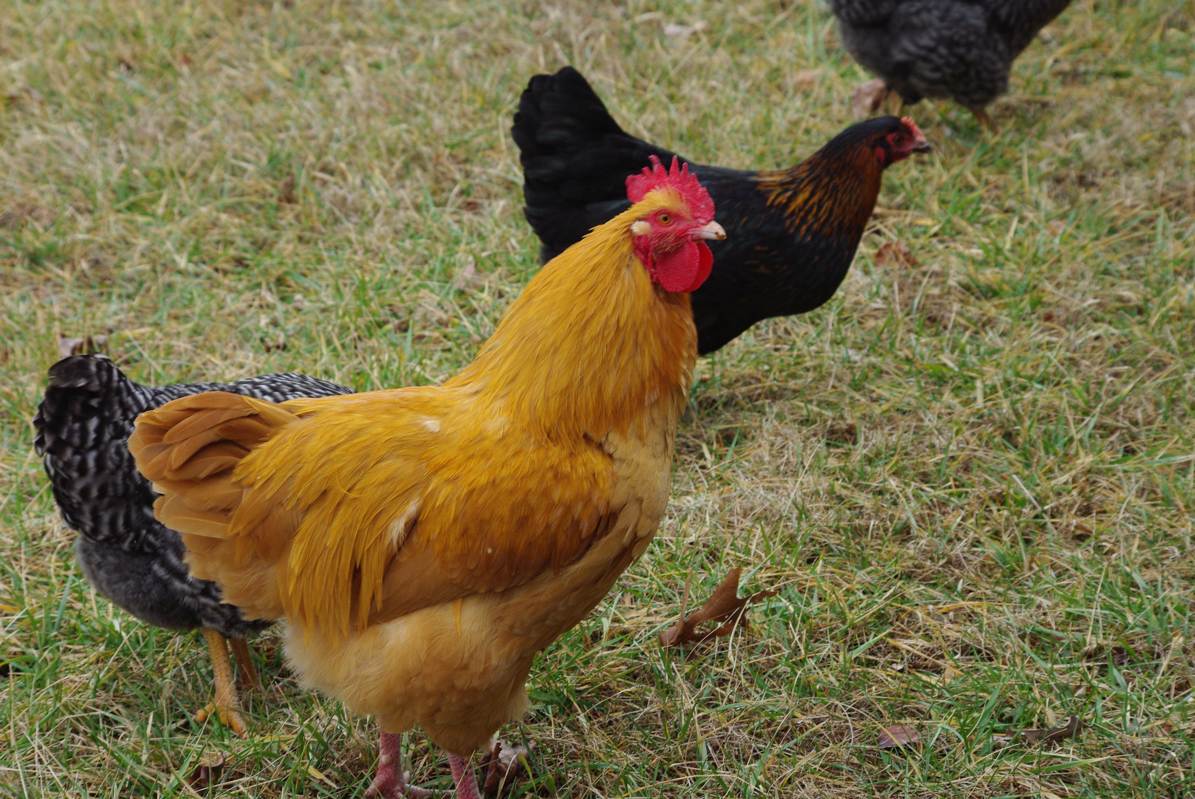 These are among my favorites of the breeds we raise: Buff Orpingtons. I have two roosters and a hen. They are pretty easy-going, so far. They have white skin, which makes them very easy to clean. I was excited to get them in my last batch of mystery chickens. I have only one hen, though. We’ll see how well she produces. These roosters are bigger than the Black Australorp in the first photo, but much milder. I am not sure if that is because they are younger, or because the breed is naturally more mild. I’m guessing Option A. Both of these guys seemed to have suffered a little frostbite on their combs this winter. That is one of the hazards of single-combed breeds, something with which the next two breeds (below) do not have to deal.
