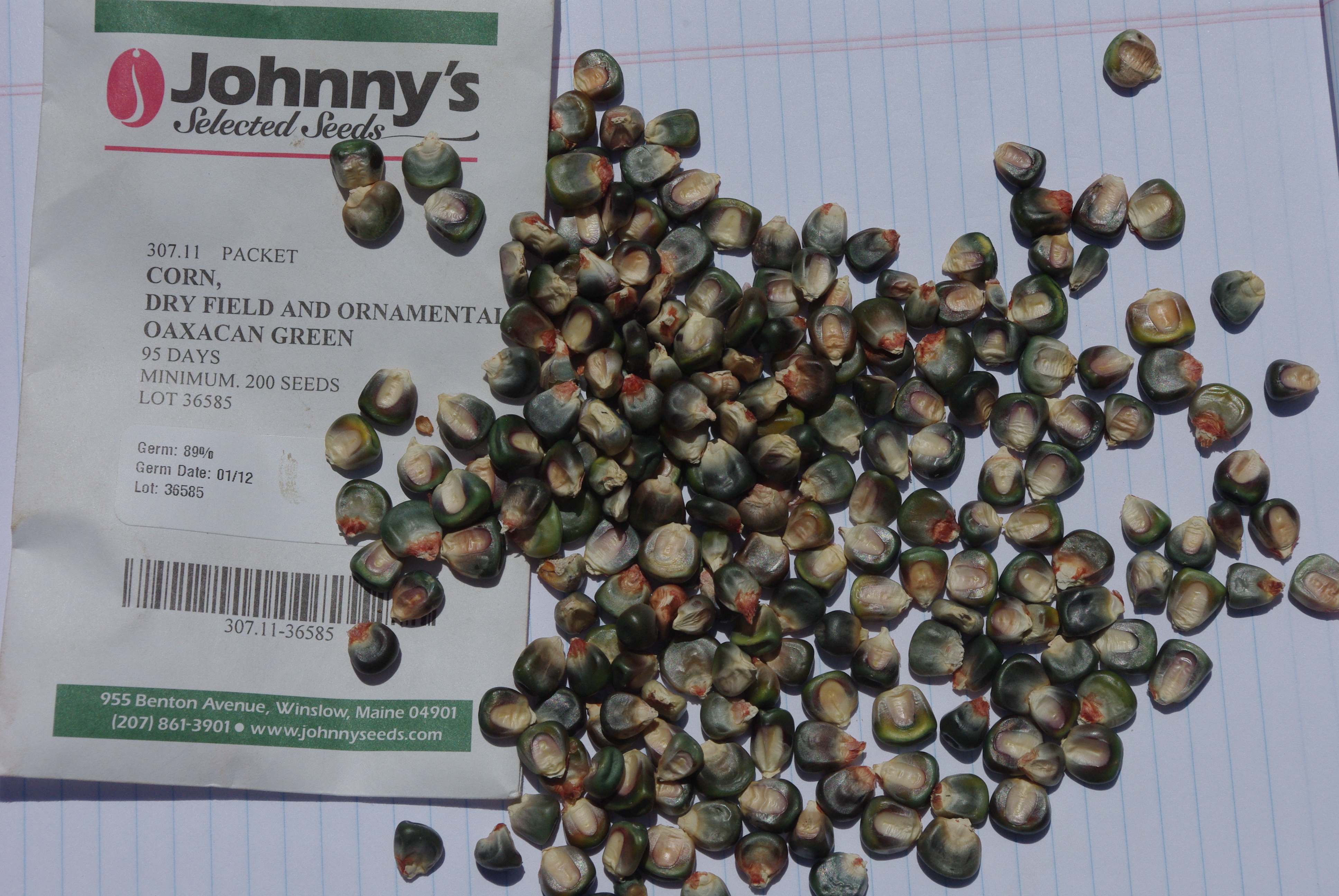 Many people use beds that are four feet wide, so that the entire bed can be weeded, harvested, cultivated, etc. from one side, without having to walk in them. However, last year I put in an 8-foot bed for corn, because if corn isn’t planted densely enough, it won’t get fully pollinated, and the ears won’t fill out entirely. Well, my 8-foot bed was not wide enough. The field corn did not fill out, some of the ears remaining completely devoid of kernels.
