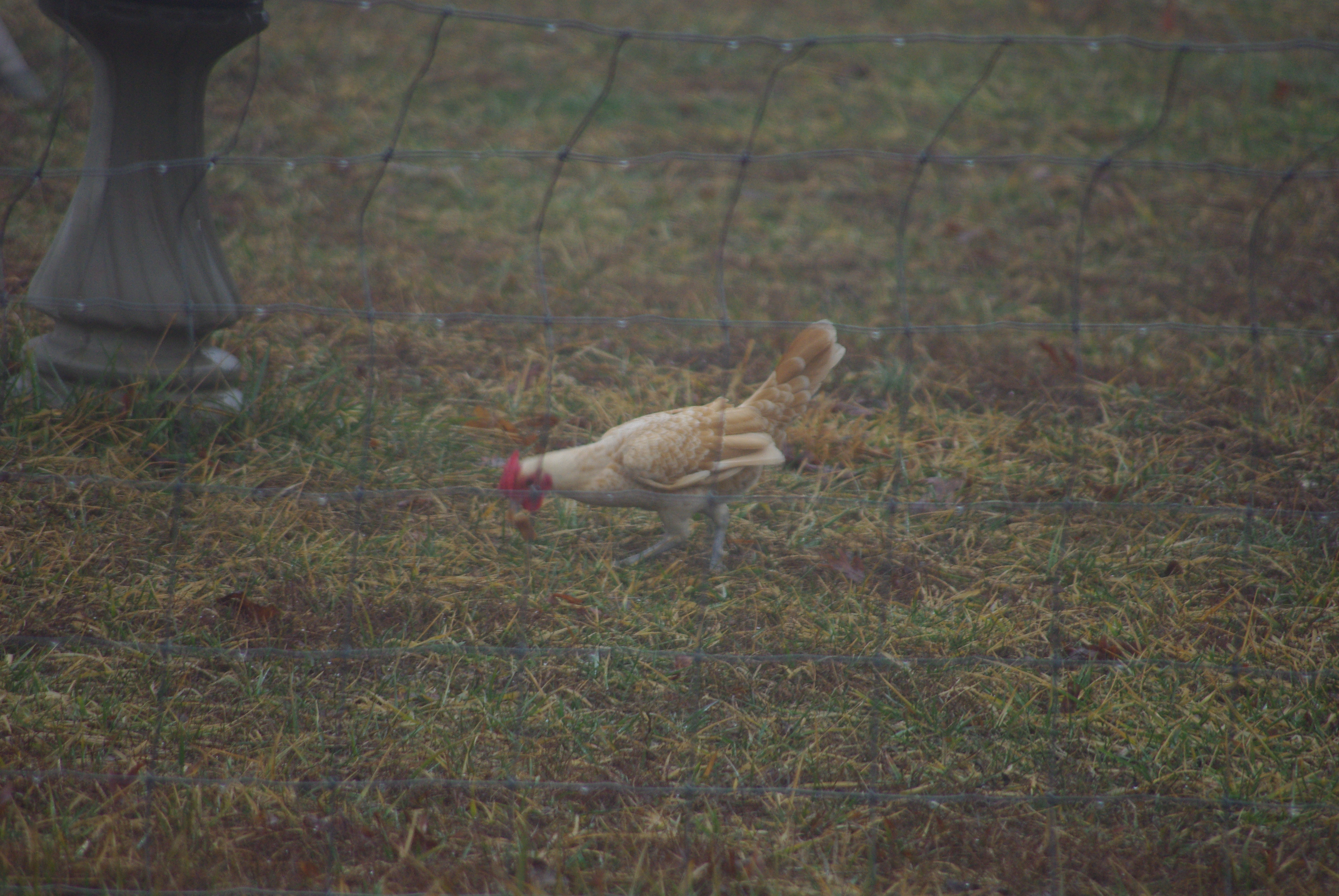 I was reminded of this bird on Friday. I pulled into the driveway after having been in Memphis all week (more on that soon). I looked back to the chickens and saw what looked like a bird in trouble. I jumped out and ran back there, and what I saw was horrifying: Buzz Butch, the Sebright bantam rooster, was dead. He was hanging by baling twine over the wall of the greenhouse. Apparently, his feet had gotten tangled in the twine, which got caught on the greenhouse bench, and he went over the edge. He appears to have flapped and flapped until the stress or exhaustion killed him. It must have been terrible. Accidents will happen.